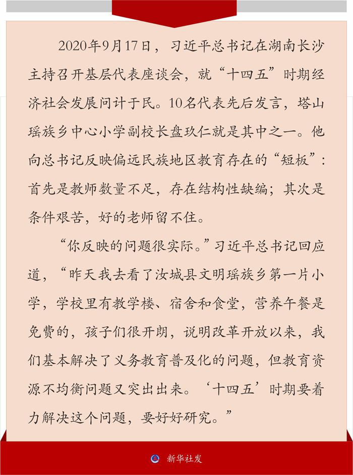 2020年9月17日,習(xí)近平總書記在湖南長沙主持召開基層代表座談會,就“十四五”時期經(jīng)濟(jì)社會發(fā)展問計于民。10名代表先后發(fā)言,塔山瑤族鄉(xiāng)中心小學(xué)副校長盤玖仁就是其中之一。他向總書記反映偏遠(yuǎn)民族地區(qū)教育存在的“短板”:首先是教師數(shù)量不足,存在結(jié)構(gòu)性缺編;其次是條件艱苦,好的老師留不住。