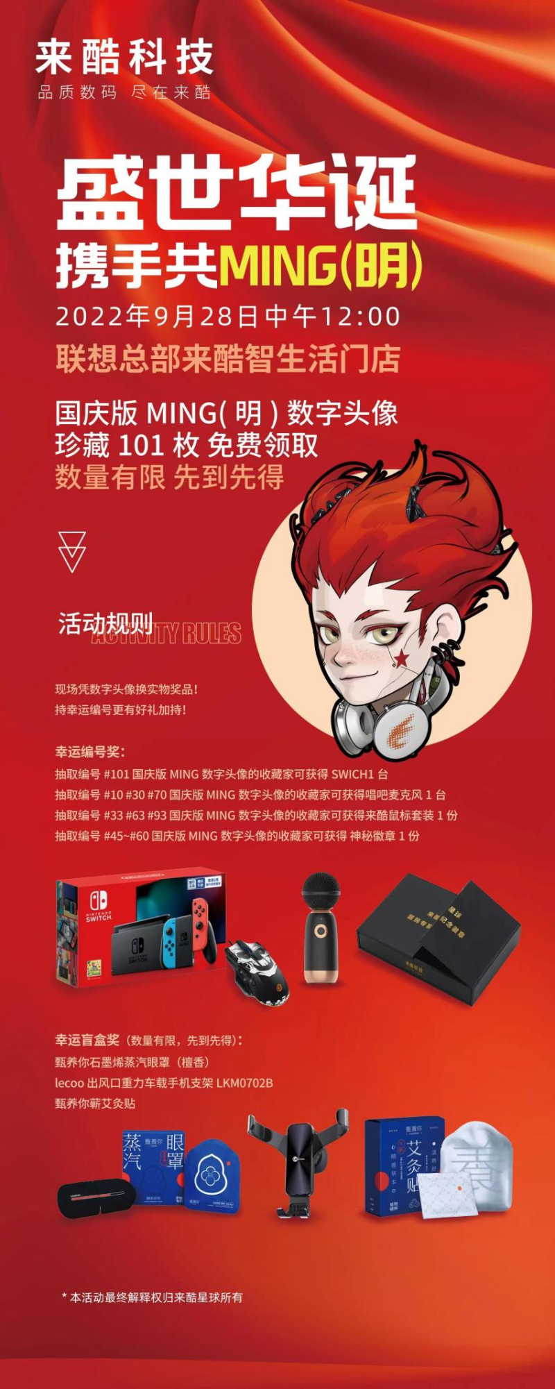 9月28日,來酷科技于聯(lián)想總部來酷智生活門店,舉辦主題為:“盛世華誕,攜手共MING(明)”為祖國送祝福的活動。活動現(xiàn)場可領(lǐng)取珍藏版101枚國慶版MING(明)數(shù)字頭像,根據(jù)每枚數(shù)字頭像編號的不同,現(xiàn)場更設(shè)置了根據(jù)收藏家國慶版MING(明)數(shù)字頭像編號,抽取神秘大獎,更有幸運(yùn)盲盒等。本次國慶版MING(明)頭像,基于MING CLUB數(shù)字版權(quán)頭像編號#616進(jìn)行二次創(chuàng)作,把十一和煙花等國慶的元素與MING(明)頭像相結(jié)合,表達(dá)了來酷星球社區(qū)對祖國生日的美好祝愿。現(xiàn)場用戶粉絲反響熱烈,更是體驗(yàn)到了打開元宇宙大門,體驗(yàn)數(shù)字藏品所帶來的魅力。