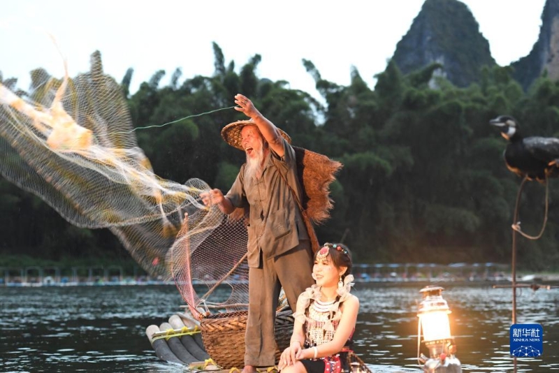 一名村民在漓江廣西陽朔縣興坪鎮(zhèn)段的竹筏上協(xié)助游客拍攝旅游影像(2022年8月25日攝)。