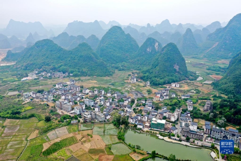 這是漓江支流遇龍河畔的“網(wǎng)紅村”——桂林市陽朔縣陽朔鎮(zhèn)雞窩渡村(2022年4月12日攝,無人機照片)。