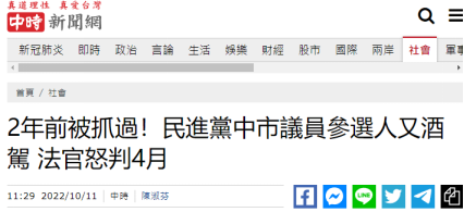 【環(huán)球網(wǎng)報道】據(jù)臺灣中時新聞網(wǎng)10月11日報道,民進黨臺中市第五選區(qū)(潭子區(qū)、大雅區(qū)、神岡區(qū))市議員參選人林義偉在今年9月12日因酒駕被警方查獲,隨后宣布退選同時退出民進黨。臺中地方法院審理認為,林曾于2020年酒駕被檢方暫緩起訴,暫緩起訴期滿后卻再次酒后駕車,判處他4個月有期徒刑,可上訴。
