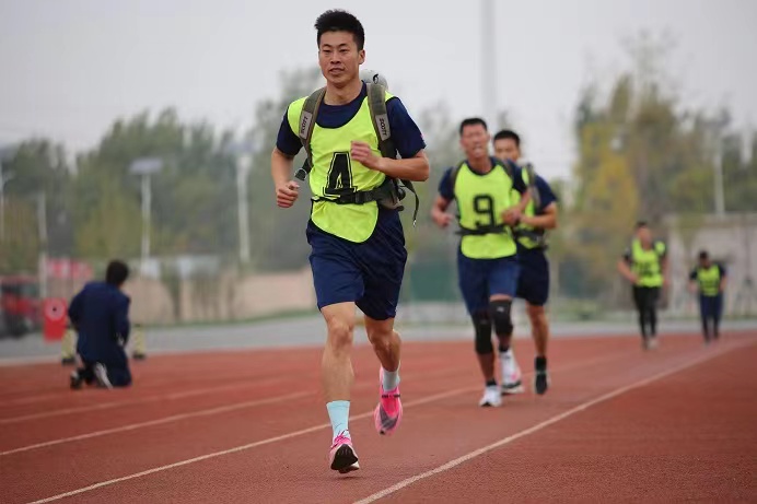 太陽初升時、驕陽似火時、夕陽西下時,訓(xùn)練場上必定會有姜海濤訓(xùn)練的身影,作為一名指揮員,他深刻的認(rèn)識到消防救援隊(duì)伍是一支“養(yǎng)兵千日、用兵千時”的隊(duì)伍,時刻擔(dān)負(fù)著救人民于水火的重任,所以從入職那天起,他就開始了他的奔跑之旅。每周最少一次的5000米跑,從來沒有因?yàn)槿魏问轮袛噙^,空跑不能滿足自己就開始負(fù)重,10年間累計(jì)奔跑里程12000多公里路,跑鞋換了不知多少雙。漸漸的姜海濤跑出了名堂,在天津總隊(duì)連續(xù)3次的5000米背負(fù)空氣呼吸器跑科目中蟬聯(lián)冠軍,多次入選總隊(duì)備戰(zhàn)首屆“火焰藍(lán)”全國大比武攻堅(jiān)組培訓(xùn)班,并代表總隊(duì)參加全國“火焰藍(lán)”大比武。但事與愿違,2022年度比賽前夕姜海濤突發(fā)腹疾,他拖著病體、忍著劇痛,他仍然咬牙完成了5000米競賽,最終取得18′05″的成績,總隊(duì)排名第六,說起這個成績姜海濤有些失落:“今年我沒有為支隊(duì)爭得更大的榮譽(yù),接下來我定將爭分奪秒,負(fù)重前行,我們明年再戰(zhàn)。”
