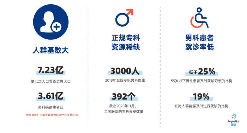 3、《中國互聯(lián)網(wǎng)男科診療白皮書2018》顯示,中國男性人口7.23億(第七次人口普查),男科疾病患病人口超3.61億,比例高達49.9%,然而全國專職男科醫(yī)生僅3000人(2018年),全國醫(yī)院的男科診室數(shù)量僅392個(2020年),半數(shù)的綜合醫(yī)院沒有配置專門的男科醫(yī)生,大部分男科的診療需求由泌尿外科醫(yī)生進行兼職。
