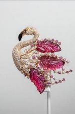 粉色火烈鳥是卡地亞動物主題作品中常見的鳥類形象。這款作品在傳統(tǒng)自然主義風(fēng)格中結(jié)合部分抽象手法,火烈鳥頭部雕刻逼真,玫瑰金與縞瑪瑙的組合突出鳥喙形象。三顆雕刻紅碧璽躍然而出,羽毛以雕刻寶石與抽象線條交錯顯現(xiàn),意趣十足。