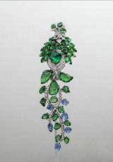 卡地亞動物王國迎來全新形象——來自南美洲的獨特鳥類,鳳尾綠咬鵑。這款胸針以非寫實手法演繹:一顆帕拉伊巴碧璽構(gòu)成鳳尾綠咬鵑的身體,鳥羽完全以綠色沙弗萊石和藍寶石組成,營造卡地亞經(jīng)典藍綠對比色的“孔雀圖案”。