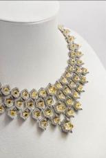 卡地亞選用獨特八面體造型黃鉆重構(gòu)龍這種奇幻生物的鱗甲。這種八邊形的幾何形狀極少用于珠寶創(chuàng)作中,彰顯卡地亞對別具個性的寶石的鐘愛之情。79顆黃鉆鑲嵌于鋪鉆六邊形幾何結(jié)構(gòu)中央,構(gòu)成盤錯的幾何網(wǎng)格。每個幾何結(jié)構(gòu)僅以下半部固定黃鉆,結(jié)構(gòu)間彼此相連,以精準(zhǔn)的設(shè)計和工藝構(gòu)筑新穎佳作。