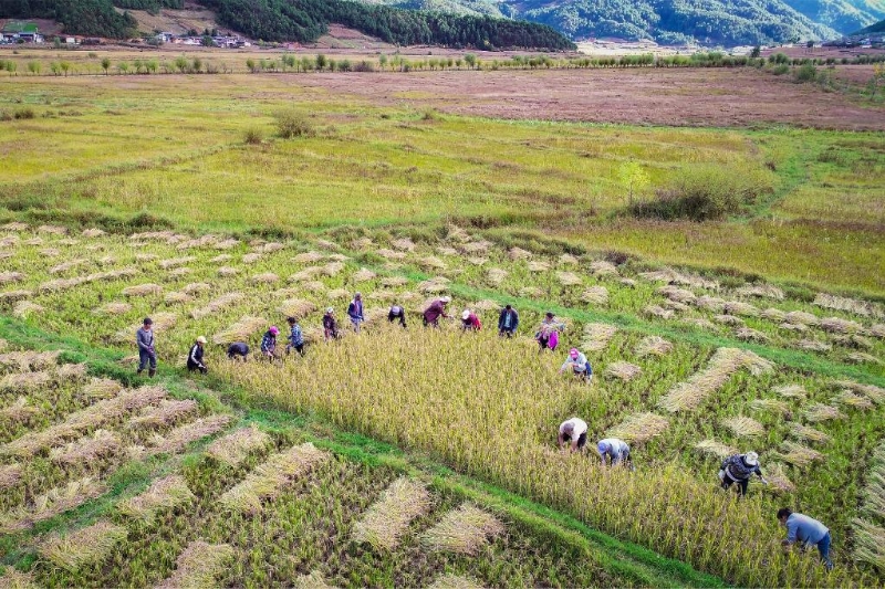 云南省維西傈僳族自治縣攀天閣鄉(xiāng)皆菊村群眾在收割黑稻(無人機(jī)照片)。新華社發(fā)(李建生 攝)