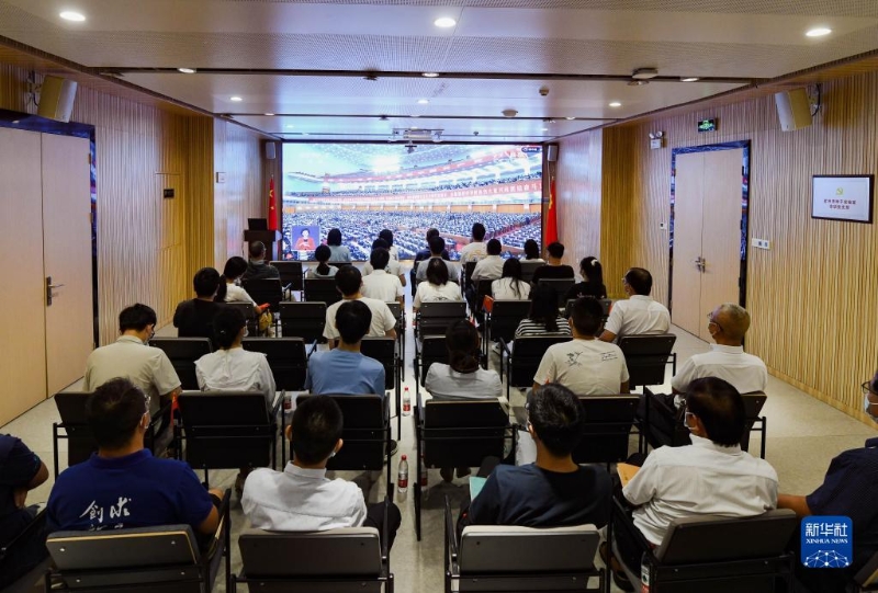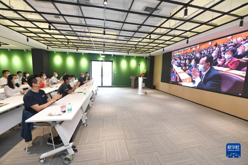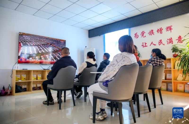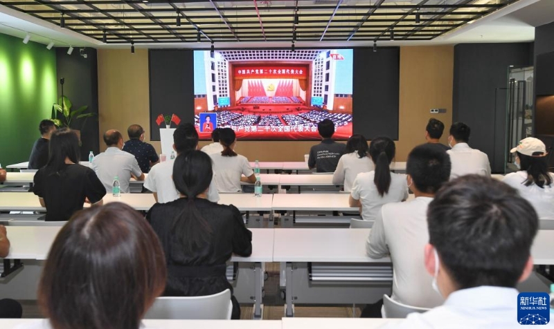 10月16日,在天津市濱海新區(qū)濱海-中關(guān)村科技園,企業(yè)員工在收看中國共產(chǎn)黨第二十次全國代表大會開幕會。