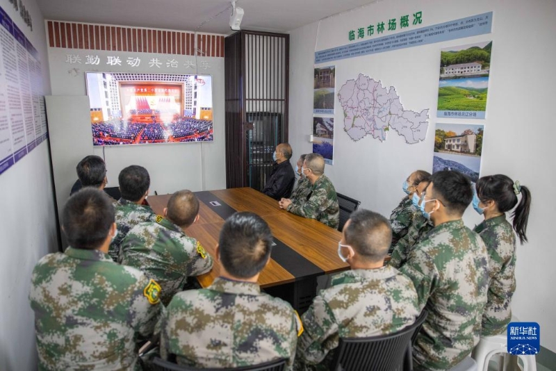 10月16日,浙江省臺州臨海市林場職工在位于括蒼山的林場內(nèi)收看中國共產(chǎn)黨第二十次全國代表大會開幕會。