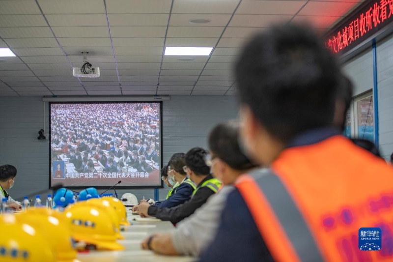 10月16日,在重慶時尚文化城項目,中建八局西南公司一線職工收看中國共產(chǎn)黨第二十次全國代表大會開幕會。