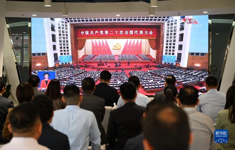 10月16日,在廣東省深圳市前海深港青年夢工場北區(qū),在前海工作的青年收看中國共產(chǎn)黨第二十次全國代表大會開幕會。