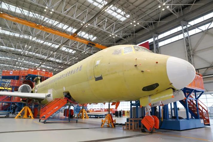 中國商飛上海飛機制造有限公司總裝車間內(nèi)的國產(chǎn)ARJ21飛機(4月23日攝)。(新華社圖)