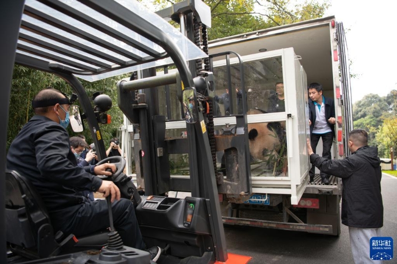 10月18日,在中國(guó)大熊貓保護(hù)研究中心雅安基地,工作人員將大熊貓“京京”轉(zhuǎn)移至車上。