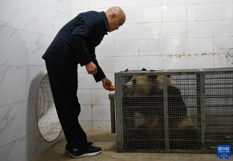 10月18日,在中國(guó)大熊貓保護(hù)研究中心雅安基地,飼養(yǎng)師董禮用胡蘿卜安撫進(jìn)入轉(zhuǎn)運(yùn)籠的大熊貓“四?!?。