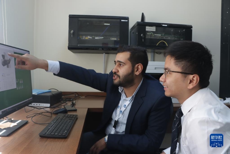 9月19日,在約旦舒巴克風(fēng)電站,三峽國(guó)際約旦新能源項(xiàng)目工程師江崧瑋(右)與舒巴克風(fēng)電站現(xiàn)場(chǎng)運(yùn)維工程師奈扎爾·阿勒胡沙曼交流工作。
