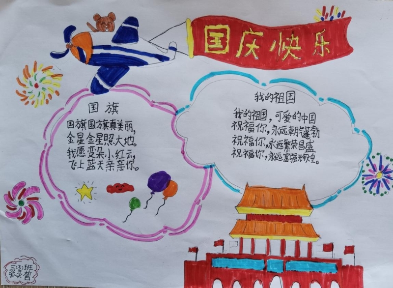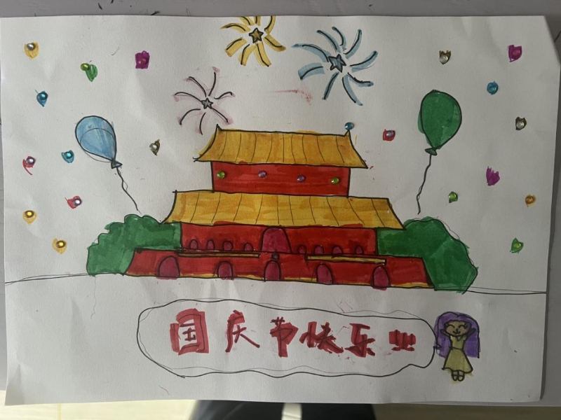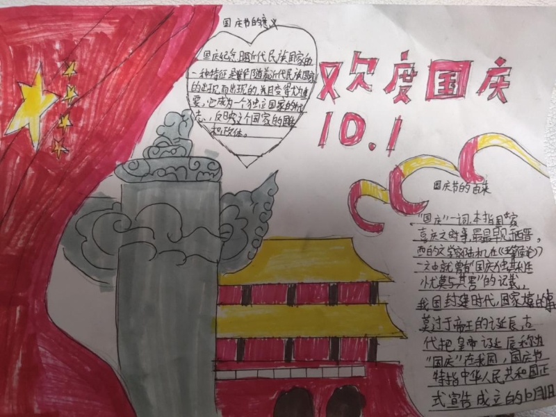 此活動得到了大家的積極響應,積極參加活動的孩子們在假期之間踴躍“潑墨”,認真繪畫,完成了高質(zhì)量的手抄報。10月8日,孩子們的手抄報交上來后,映入眼簾的作品給人驚喜,大家的作品童趣橫生,采用圖片、文字結(jié)合的方式,有的手抄報上繪畫了天安門城樓,有的是中英文結(jié)合的方式,有的是紅星紅旗與華表結(jié)合,均充分表達了個人喜迎國慶節(jié)的激動之情,能明顯感覺到大家油然而生的作為中國人的自豪感。