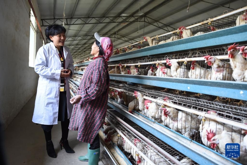 二十大代表余留芬(左)在養(yǎng)殖場內(nèi)與工作人員交談(2017年10月29日攝)。新華社記者 歐東衢 攝