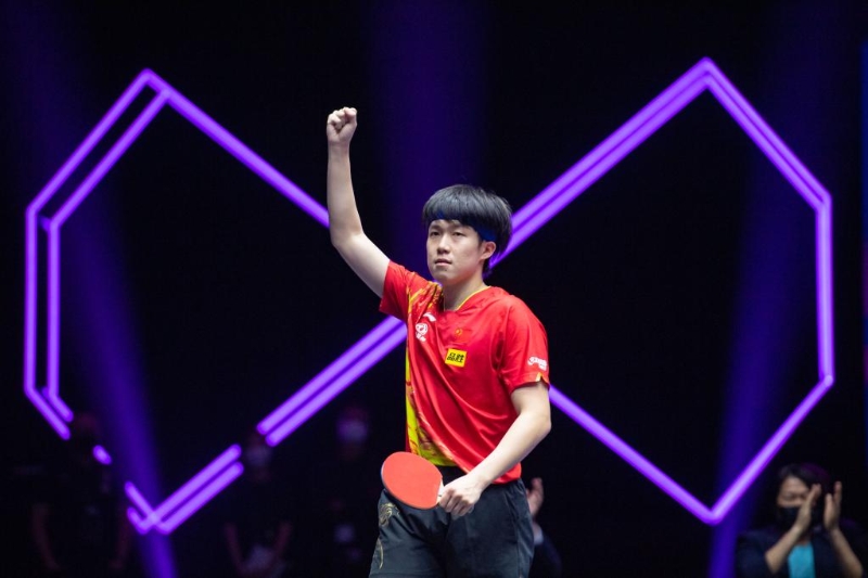 10月23日,王楚欽在比賽中慶祝得分。新華社記者 張金加 攝