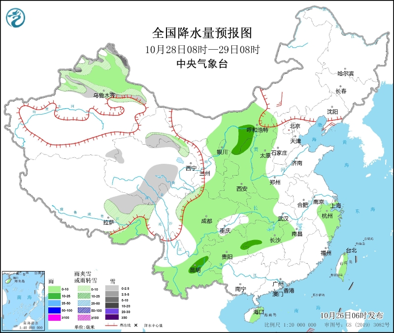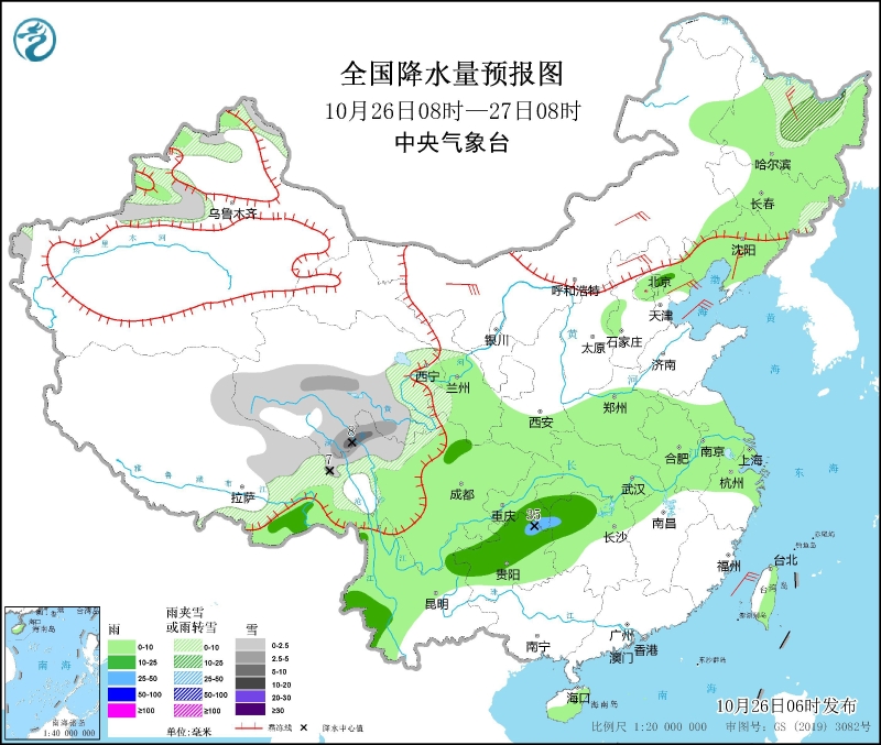 10月26日08時(shí)至27日08時(shí),西藏東部、青海南部和東部、川西高原北部以及黑龍江北部、新疆北疆西部和北部等地部分地區(qū)有小到中雪或雨夾雪,其中,西藏東北部、青海東南部、川西高原北部等地部分地區(qū)有大雪(5~8毫米)。東北地區(qū)大部、北京、天津、河北中部和東北部以及西南地區(qū)大部、西北地區(qū)東南部、江漢、黃淮西部、江淮、江南西部和北部等地部分地區(qū)有小到中雨,其中,湖南西北部、貴州東北部等地局地有大雨(25~35毫米)。內(nèi)蒙古、華北北部、黑龍江、遼寧等地部分地區(qū)有4~6級(jí)風(fēng)(見圖1)。