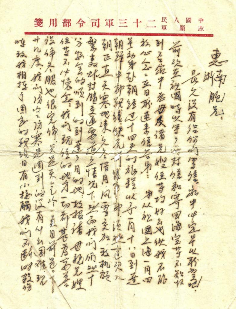 “現(xiàn)時(shí)敵我相持于固定的戰(zhàn)線,日有小接觸,我們不斷殺傷和小股殲滅著美寇強(qiáng)盜。敵人于(如)果敢于發(fā)動(dòng)大的攻擊作戰(zhàn),則我必定獲得大的勝利?,F(xiàn)在我們志愿軍全體同志都在為打更大的勝仗,消滅更多的敵人而努力著。我們在前線上努力殺敵保衛(wèi)祖國,保衛(wèi)世界和平。母親和兄嫂等是光榮的家屬,應(yīng)當(dāng)努力生產(chǎn)為建設(shè)新中國和支援前線而努力才好,這是一個(gè)希望。”