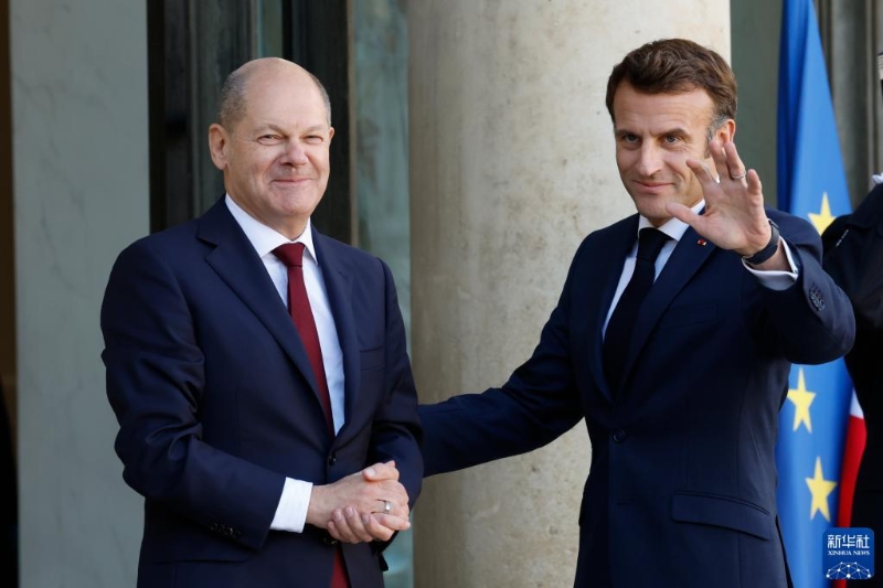 10月26日,在法國巴黎,法國總統(tǒng)馬克龍(右)在總統(tǒng)府愛麗舍宮迎接德國總理朔爾茨。新華社發(fā)(里特·埃斯攝)