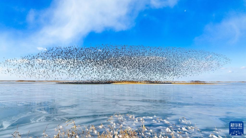 這是2021年12月25日在山東黃河三角洲國家級自然保護(hù)區(qū)拍攝的鳥群(無人機(jī)照片)。