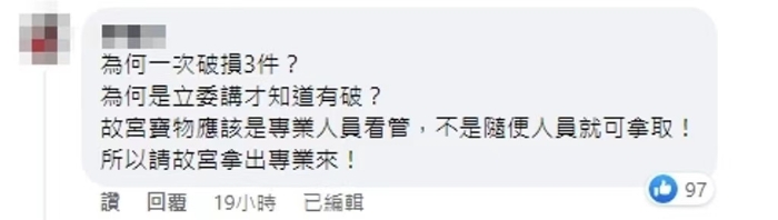 有網(wǎng)友表示:“怎么一到你們手中就連破3個(gè),你們對(duì)得起用生命護(hù)送的前輩嗎?”“為什么會(huì)打破呢?故宮不是都有鋪厚地毯各種保護(hù)的設(shè)備嗎,是否可以說明后續(xù)是怎么補(bǔ)強(qiáng)保護(hù)設(shè)備、文物移動(dòng)流程,確保下次不會(huì)再發(fā)生呢?”“為何一次破損3件?為何是‘立委’講才知道有破?”。