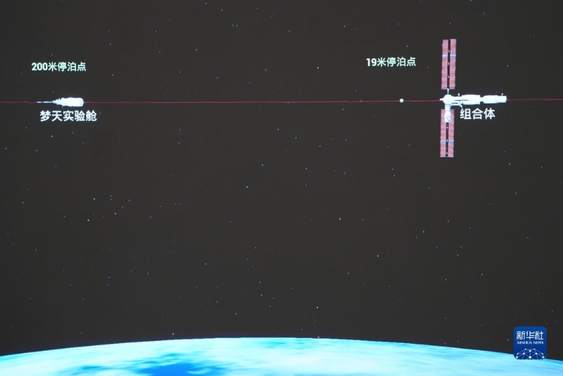 11月1日在北京航天飛行控制中心拍攝的空間站夢天實(shí)驗(yàn)艙與空間站組合體在軌完成交會對接。這是夢天實(shí)驗(yàn)艙從200米停泊點(diǎn)向19米停泊點(diǎn)靠近的模擬圖像。新華社發(fā)(孫豐曉 攝)