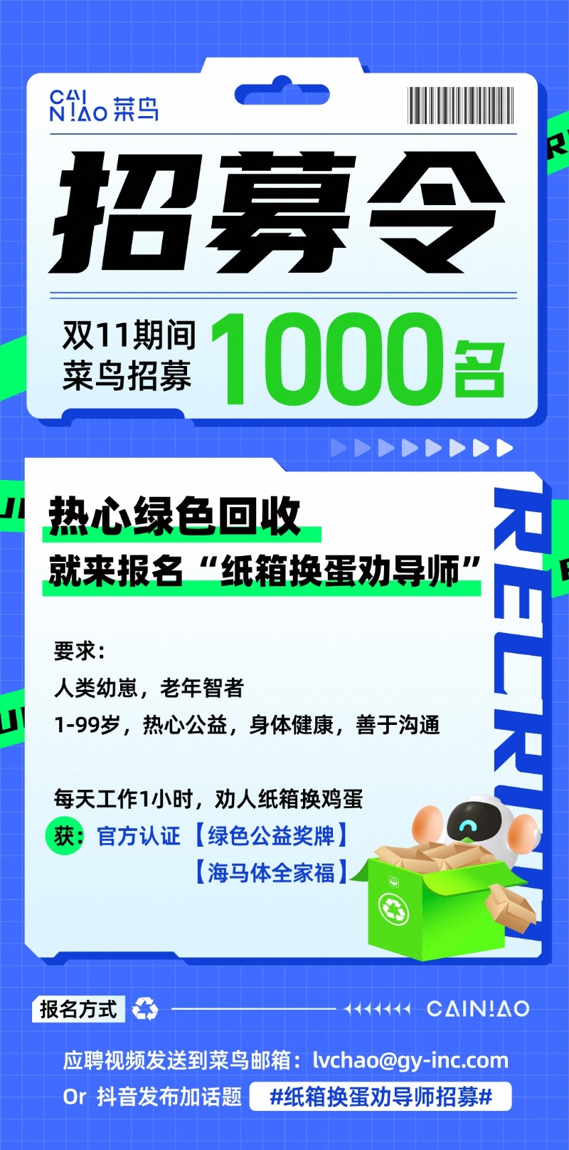 為了打消大家的疑慮,菜鳥希望通過招募官方認(rèn)可的“紙箱換蛋勸導(dǎo)師”,在驛站現(xiàn)場為消費(fèi)者普及環(huán)保知識,協(xié)助消費(fèi)者參與綠色回收。