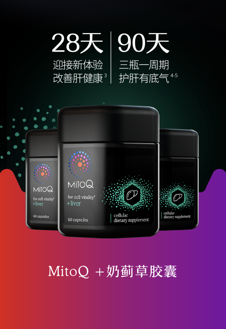 始終專注于細胞健康領(lǐng)域的MitoQ,其明星產(chǎn)品MitoQ+奶薊草膠囊區(qū)別于市面的普通產(chǎn)品。在這個“卷含量,拼純度”的補充劑主流市場下,MitoQ不卷含量,只看護肝效果:每粒膠囊僅含5mg微小MitoQ成分,搭配更少的專利奶薊草成分,反而大幅提升生物利用度,釋放更大的能量。