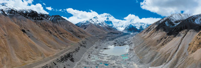 藏南絨布峽谷滑脫構(gòu)造體系是一組平行喜馬拉雅山造山帶的低角度正斷層性質(zhì)的韌性剪切帶,沿著喜馬拉雅的整個走向進行延伸,其發(fā)現(xiàn)徹底改變了喜馬拉雅造山帶的模型,極大提高了對喜馬拉雅造山帶構(gòu)造—變質(zhì)演化的認識。絨布峽谷是藏南拆離系發(fā)育的典型地區(qū),具有重要科學(xué)價值。圖為珠峰北坡,最遠處為珠峰,中部是絨布冰川,近處是絨布冰川湖,兩側(cè)為絨布溝壁,壁上黑白巖石分界處即為絨布峽谷藏南拆離系。王承文攝(人民視覺)