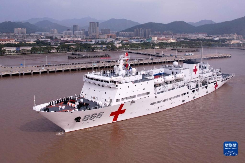 11月2日,執(zhí)行“和諧使命-2022”任務的中國海軍“和平方舟”號醫(yī)院船從浙江舟山某軍港解纜起航(無人機照片)。新華社發(fā)(劉鋒 攝)