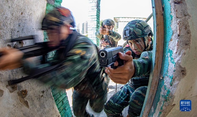 武警廣西總隊北海支隊學習貫徹黨的二十大精神,掀起練兵備戰(zhàn)熱潮,組織特戰(zhàn)隊員開展綜合演練(10月27日攝)。新華社發(fā)(梁承杰 攝)