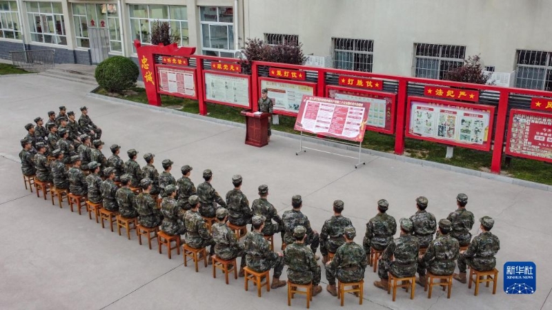 武警陜西總隊漢中支隊組織官兵通過“微課堂”形式學習宣傳黨的二十大精神(10月30日攝)。新華社發(fā)(李淼 攝)