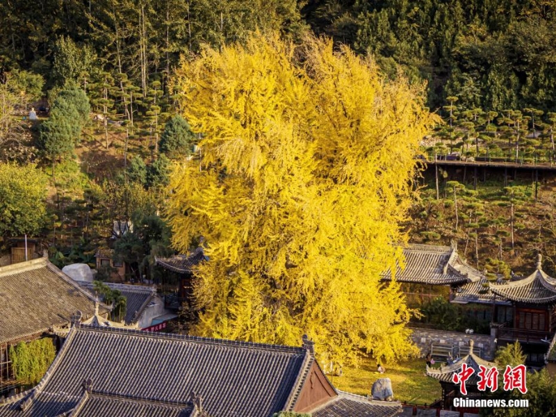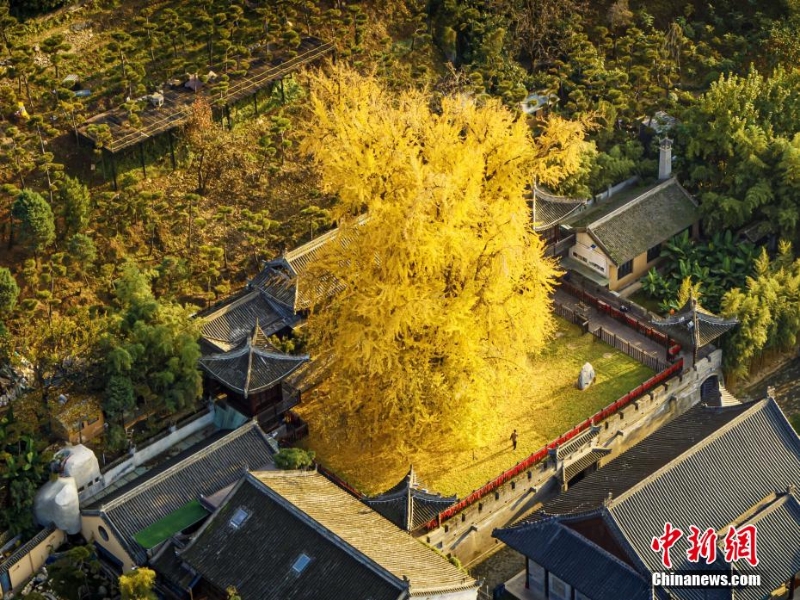 11月,西安古觀音禪寺里的千年銀杏樹又迎來了自己的“閃亮?xí)r刻”。高數(shù)十米的銀杏樹,樹葉泛黃,落葉繽紛。遠(yuǎn)遠(yuǎn)望去,仿佛是山間噴涌而出的一股金色噴泉。如此美景,令觀者陶醉。劉夙培 攝