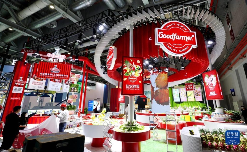 11月2日,工作人員在佳農(nóng)鮮果進(jìn)博會(huì)展臺(tái)進(jìn)行布展工作。