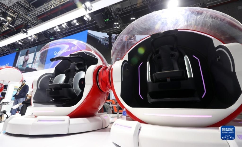 11月2日拍攝的美國(guó)高通公司展臺(tái)上的一組游戲體驗(yàn)倉(cāng)展品。
