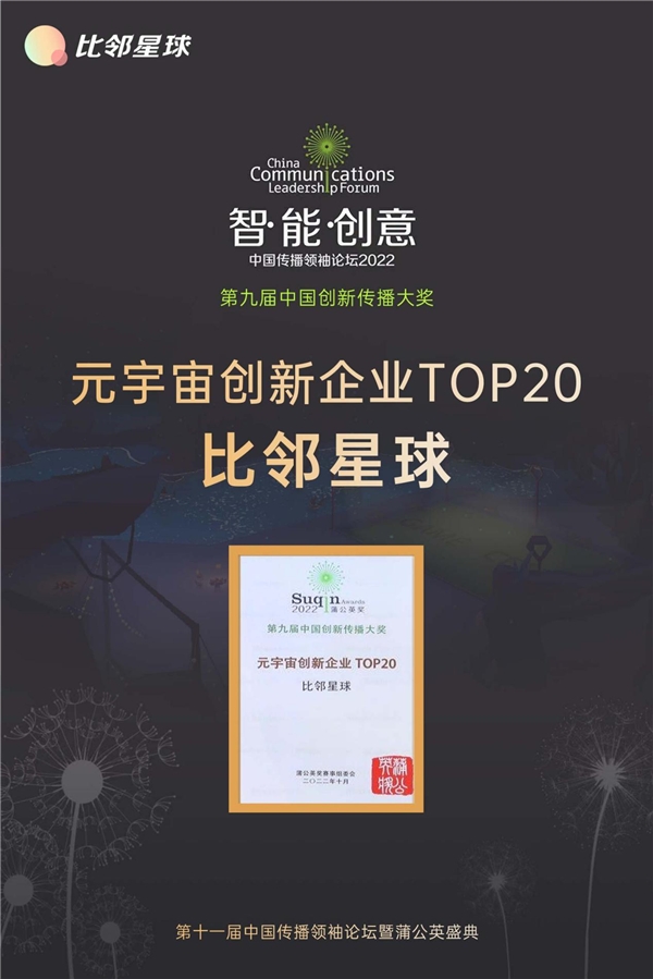 10月29日,中國傳播領(lǐng)袖論壇暨蒲公英盛典在北京舉行,并在現(xiàn)場頒發(fā)獎項。比鄰星球創(chuàng)始人段志云榮膺有“中國傳播行業(yè)最高榮譽”之稱的“中國傳播年度人物”,并受邀參加中國傳播領(lǐng)袖論壇圓桌會議,發(fā)表“元宇宙:新媒介,新人群,品牌新戰(zhàn)場”的主題分享。經(jīng)過專家評審團嚴格審核評估和終審?fù)镀?比鄰星球從眾多參賽企業(yè)激烈角逐中脫穎而出,斬獲兩項大獎,榮登元宇宙創(chuàng)新企業(yè)TOP20榜單。