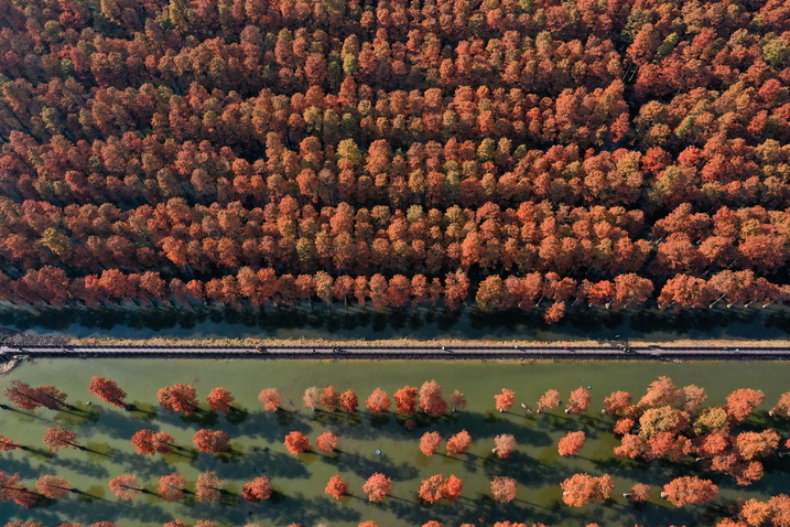 武漢漲渡湖濕地公園“水上森林”色彩斑斕。新華社發(fā)(趙軍攝)