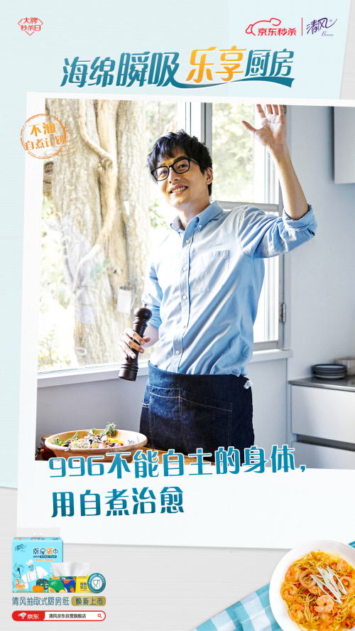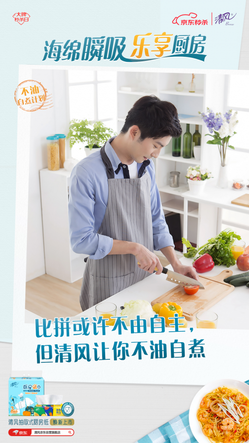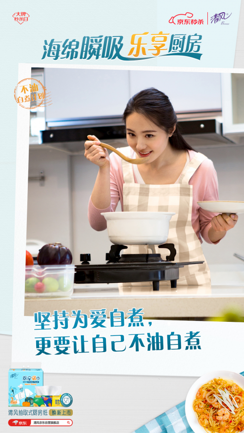 為此,清風推出“不油自煮計劃”, 以煥新上市的清風海綿吸廚房紙巾為依托,用“一抹即凈”的不油體驗和“一掃就會”的自煮攻略,幫助用戶破除廚房恐懼,給不同身份的用戶輕松自煮不油膩的廚房體驗,讓TA們能不由自主地愛上烹飪,輕松享受做飯帶來的快樂。