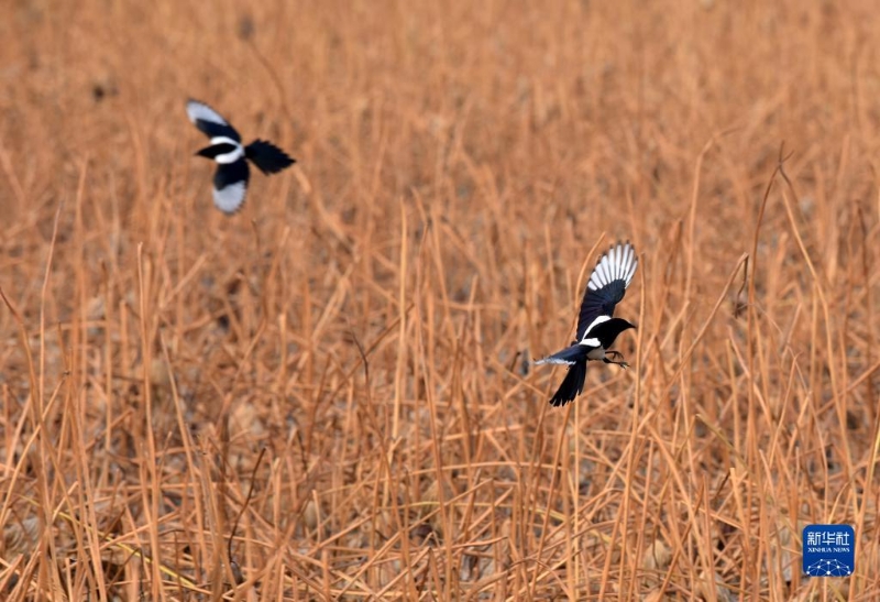 11月5日,喜鵲在安徽巢湖半島國家濕地公園內飛翔。