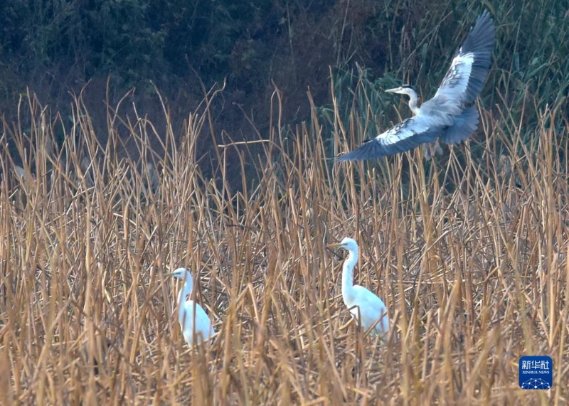 11月5日在安徽巢湖半島國家濕地公園內拍攝的白鷺(下)和蒼鷺。