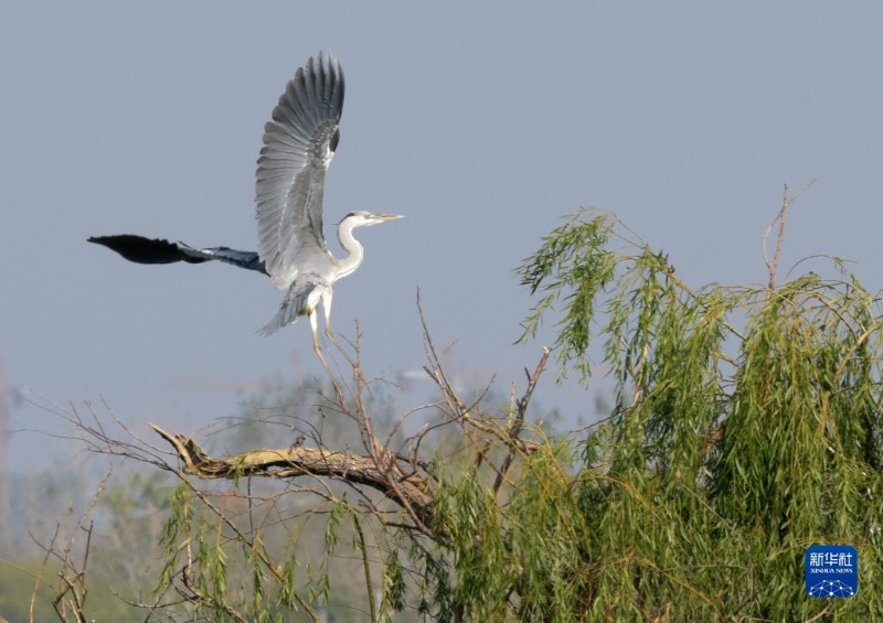 11月5日,一只蒼鷺在安徽巢湖半島國家濕地公園內飛翔。