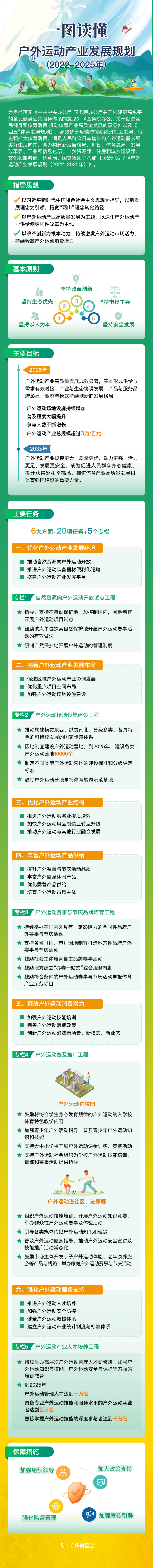 《規(guī)劃》提出,到2025年,戶外運動產業(yè)高質量發(fā)展成效顯著,基本形成供給與需求有效對接、產業(yè)與生態(tài)協(xié)調發(fā)展、產品與服務品牌彰顯、業(yè)態(tài)與模式持續(xù)創(chuàng)新的發(fā)展格局。戶外運動場地設施持續(xù)增加,普及程度大幅提升,參與人數不斷增長,戶外運動產業(yè)總規(guī)模超過3萬億元。到2035年,戶外運動產業(yè)規(guī)模更大、質量更優(yōu)、動力更強、活力更足、發(fā)展更安全,成為促進人民群眾身心健康、提升獲得感和幸福感、推進體育產業(yè)高質量發(fā)展和體育強國建設的重要力量。