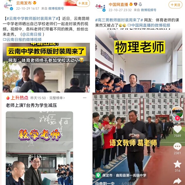 記者了解到,由于受疫情影響,不少學(xué)校采取了封控措施,為了豐富校園生活,減緩壓力,一些老師突發(fā)奇想,在校園中開展“時(shí)裝走秀”活動(dòng),并將視頻上傳至微信、微博、抖音等社交平臺,收獲了廣泛好評。之后,各地學(xué)校紛紛模仿,尤其是許多初高中任課老師“申請出戰(zhàn)”,希望通過展現(xiàn)自己的“另一面”, 讓那些背負(fù)升學(xué)壓力的同學(xué)們的緊張情緒得到有效釋放。
