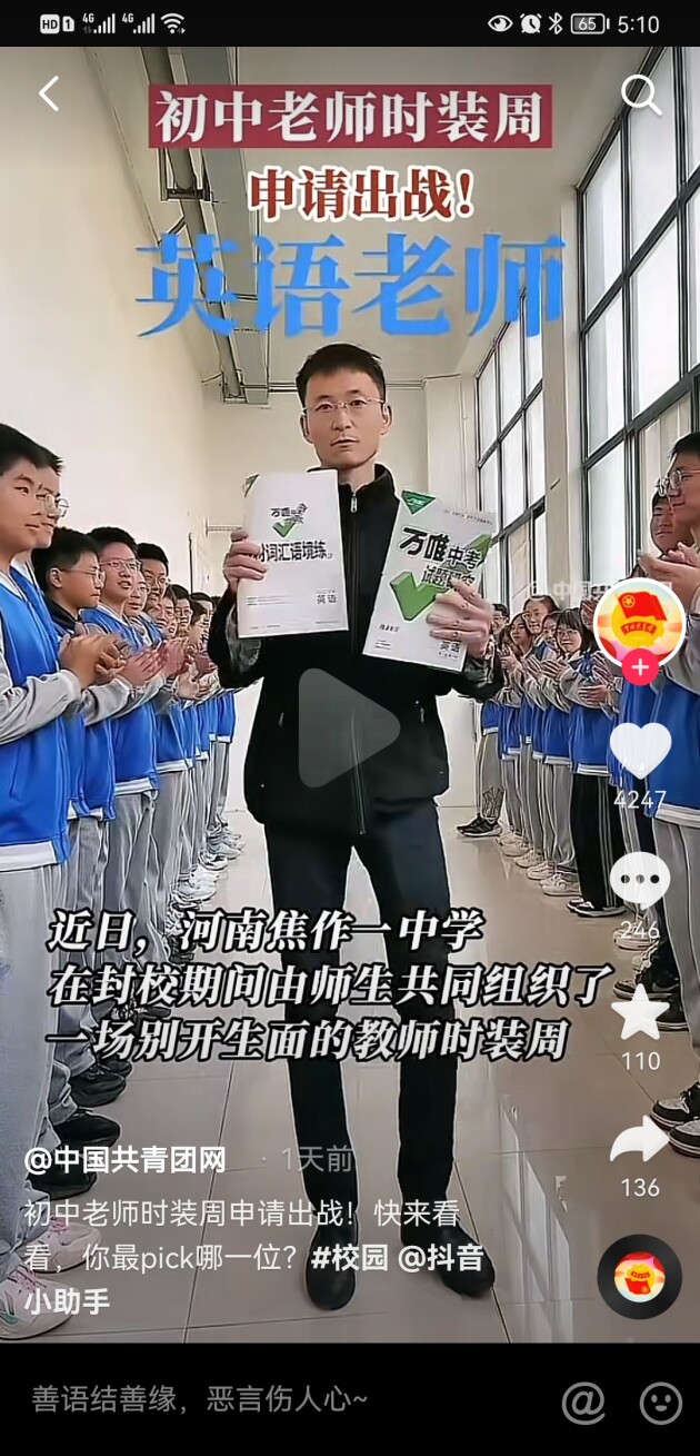 記者還注意到,“老師時(shí)裝秀”的相關(guān)視頻覆蓋面非常廣泛,在吉林、河北、河南、陜西、安徽、云南等多地校園均有出現(xiàn),其中一段河南焦作的“走秀”短視頻更是得到了中國共青團(tuán)網(wǎng)抖音賬號的轉(zhuǎn)發(fā)。據(jù)悉,該視頻來源于焦作的一所初中,語文、數(shù)學(xué)、英語、物理等各科老師幾乎都參與了“走秀”,學(xué)生們在一旁喝彩鼓掌,每個(gè)人臉上都洋溢著歡樂的笑容。