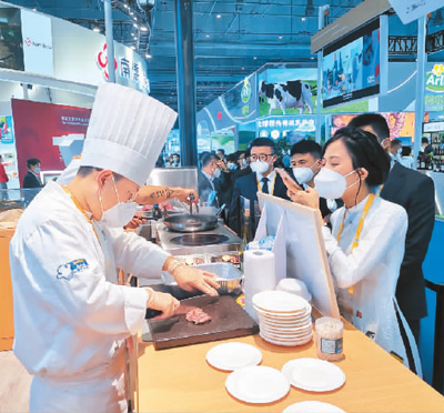 在第五屆進(jìn)博會(huì)食品與農(nóng)產(chǎn)品展區(qū)麥德龍展臺(tái),參觀者排隊(duì)品嘗現(xiàn)場(chǎng)煎制的進(jìn)口牛排。本報(bào)記者 王俊嶺攝