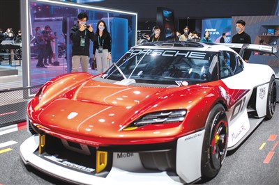 在第五屆進(jìn)博會(huì)汽車展區(qū)的大眾展臺(tái),亞洲首秀的保時(shí)捷純電動(dòng)賽車Mission R亮相。翁奇羽攝(人民視覺(jué))