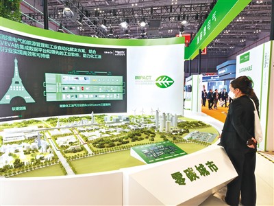 第五屆進(jìn)博會(huì)技術(shù)裝備展區(qū)施耐德電氣展臺(tái)前,人們正在觀看施耐德電子零碳城市模型的演示。本報(bào)記者 孔德晨攝