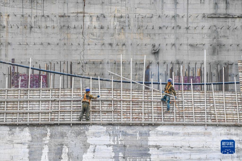 11月7日,工人在天角潭水利樞紐工程主壩進(jìn)行混凝土澆筑施工。